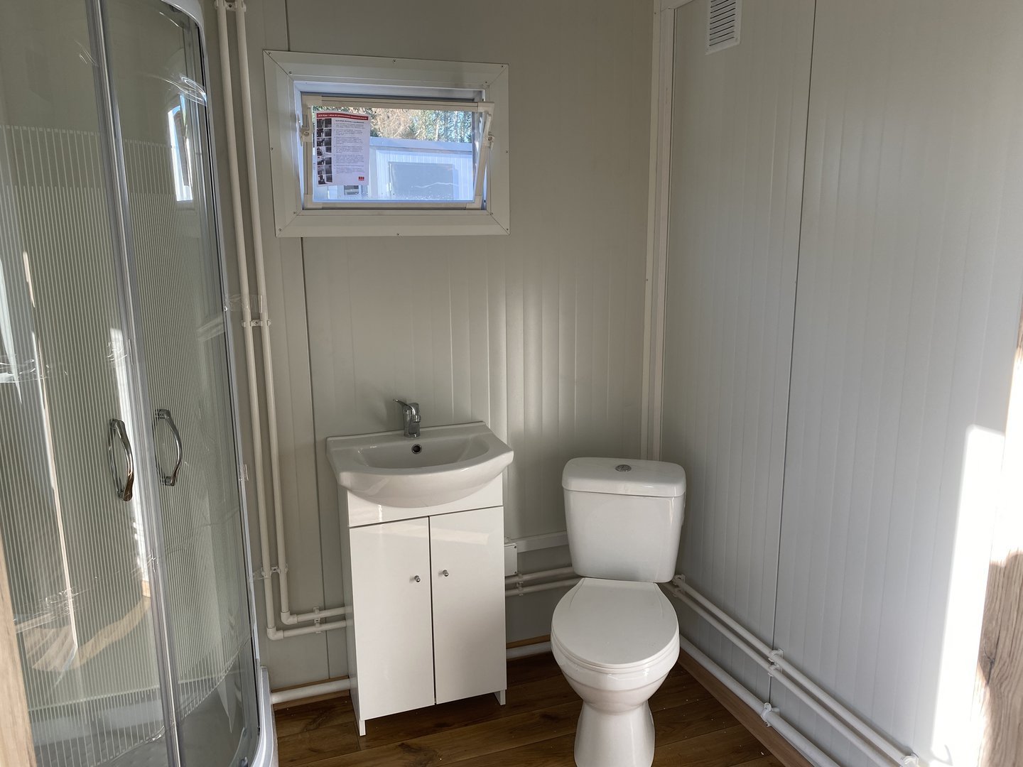 Il inclut un espace sanitaire complet avec douche, lavabo, urinoir et des pré-équipements pour lave-linge ou kitchenette. Installation électrique industrielle 400V et chauffage inclus. Structure autoportante robuste, déplaçable par grue ou chariot élévateur.