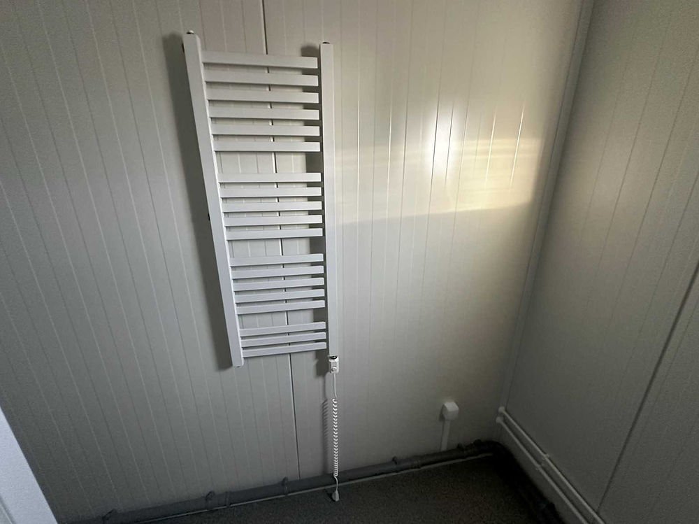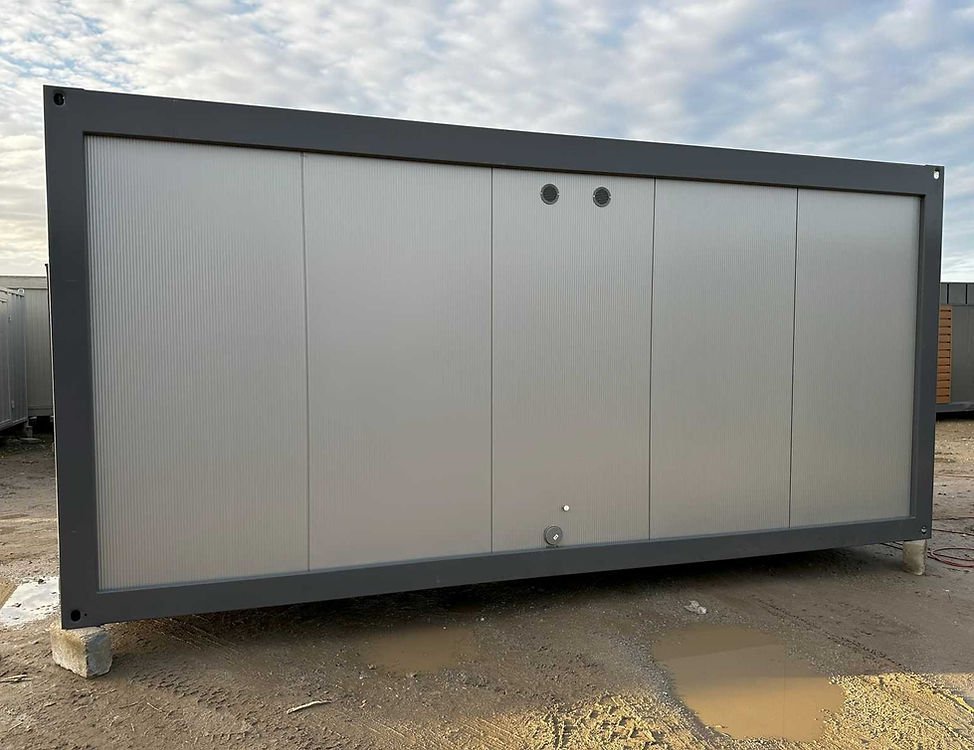 Container Sanitaire 20 Pieds Occasion (6×2,4m) – Bloc de 6 Douches avec Ballon 300L et Espace Buanderie
