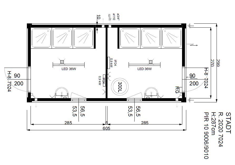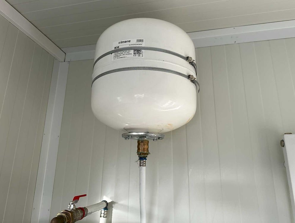 Construit sur une structure métallique robuste (format container maritime), il dispose d’un double accès (une porte sur le côté court et une porte sur le côté long) qui facilite le flux de personnes et la ventilation. Le cœur du module est son système hydraulique, soutenu par un <strong>ballon d’eau chaude industriel de 300 litres</strong> garantissant une réserve d’eau chaude suffisante pour l’utilisation simultanée des douches.