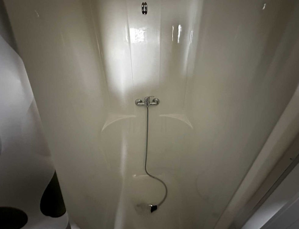 Haute capacité pour flux importants d’utilisateurs. Ce container sanitaire de 6 x 2,44 mètres (Occasion en bon état) est configuré comme un bloc douches intensif, offrant 6 postes servis par un puissant ballon d’eau chaude de 300 Litres.
