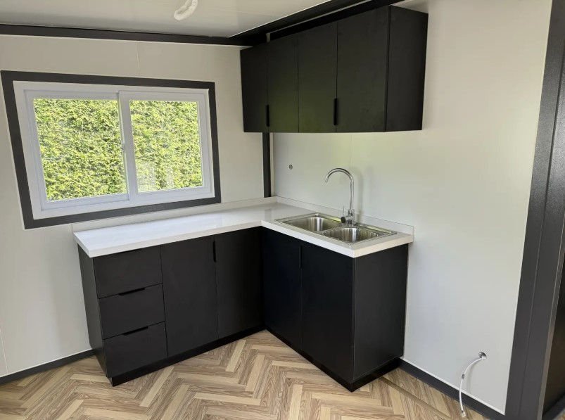 Le point fort réside dans l’organisation des espaces intérieurs : la pièce de vie lumineuse avec sa cuisine en L est accompagnée de <strong>deux chambres fermées</strong> et d’une salle de bain complète au design soigné. L’attention aux détails est évidente, des sols en vinyle faciles d’entretien à la robinetterie moderne, sans oublier l'<strong>isolation haute performance</strong> qui protège efficacement de la chaleur et du froid. Elle est parfaite comme résidence principale ou comme maison de vacances de luxe.